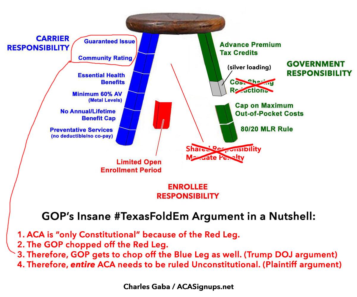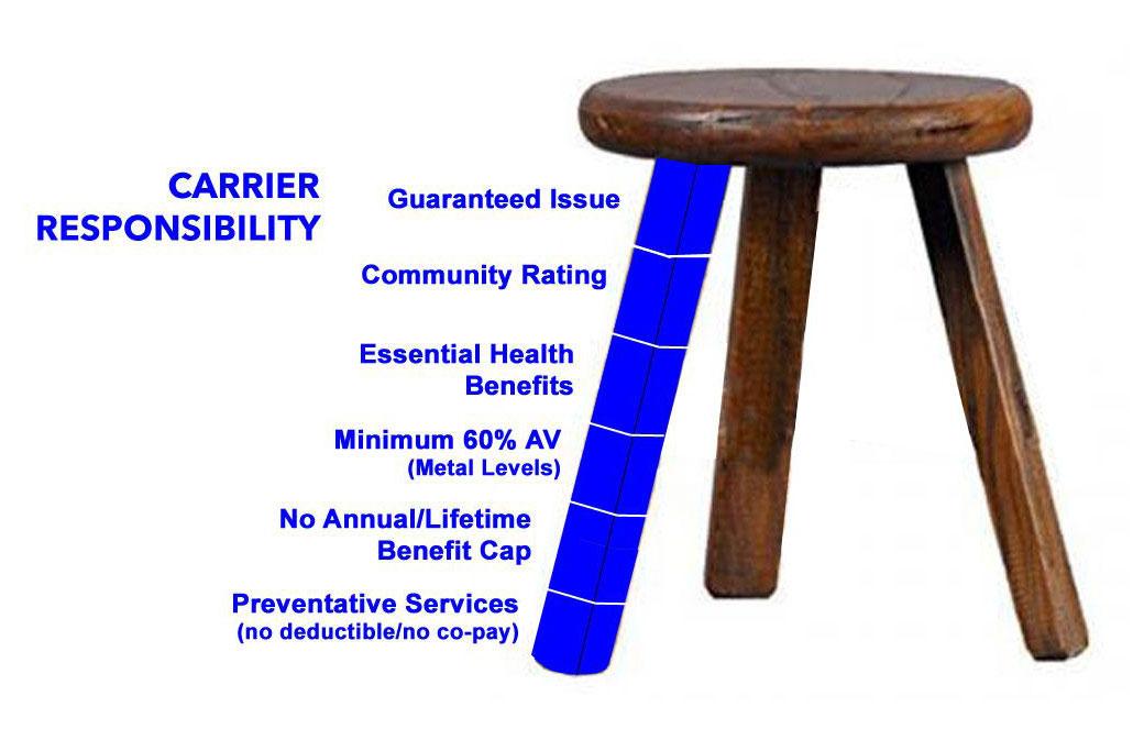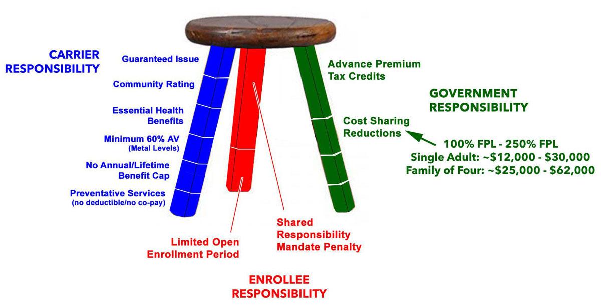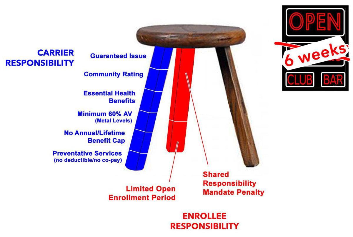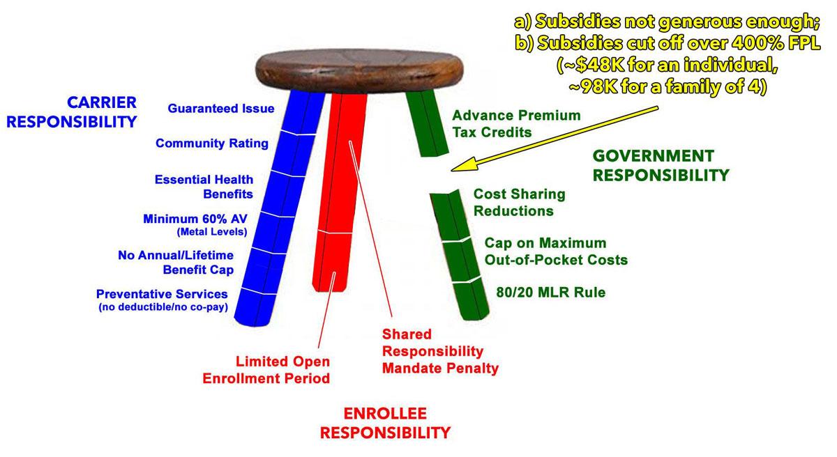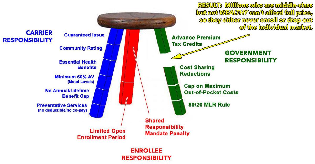 So, to avoid this from happening, when Mitt Romney, then the Republican Governor of Massachusetts, signed RomneyCare into law, the individual market was set up as a THREE-legged stool…and the Affordable Care Act used this politically conservative model as well.