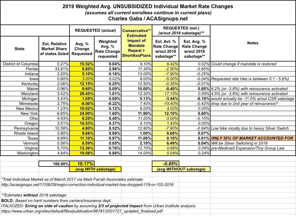 Those yellow and manilla cells at the bottom are not a typo: To the best of my estimates so far, the insurance carriers across these 19 markets are asking for average 2019 unsubsidized premium rate increases of around 10-11%...however, as far as I can tell, they would be keeping rates FLAT year over year (on average), for the first time since the ACA launched, if not for three sabotage efforts by Donald Trump and Congressional Republicans: Repeal of the ACA's individual mandate, and Trump's removal of restrictions on non-ACA compliant "Short-Term, Limited Duration" and "Association" plans, which I've shorthanded as simply #ShortAssPlans....and in fact would actually be dropping in quite a few states (or, in the case of Minnesota, dropping more than they already are set to with those factors):