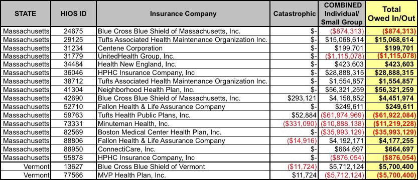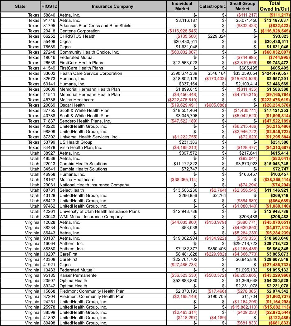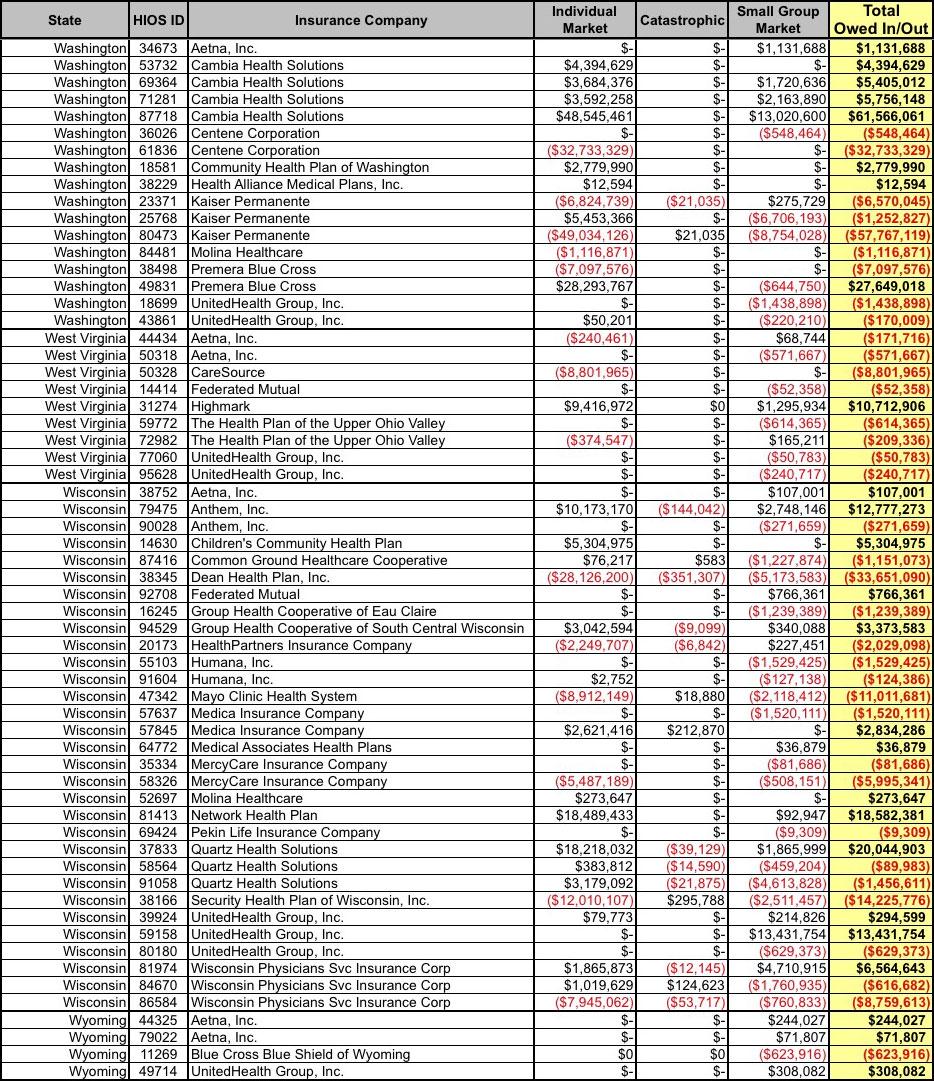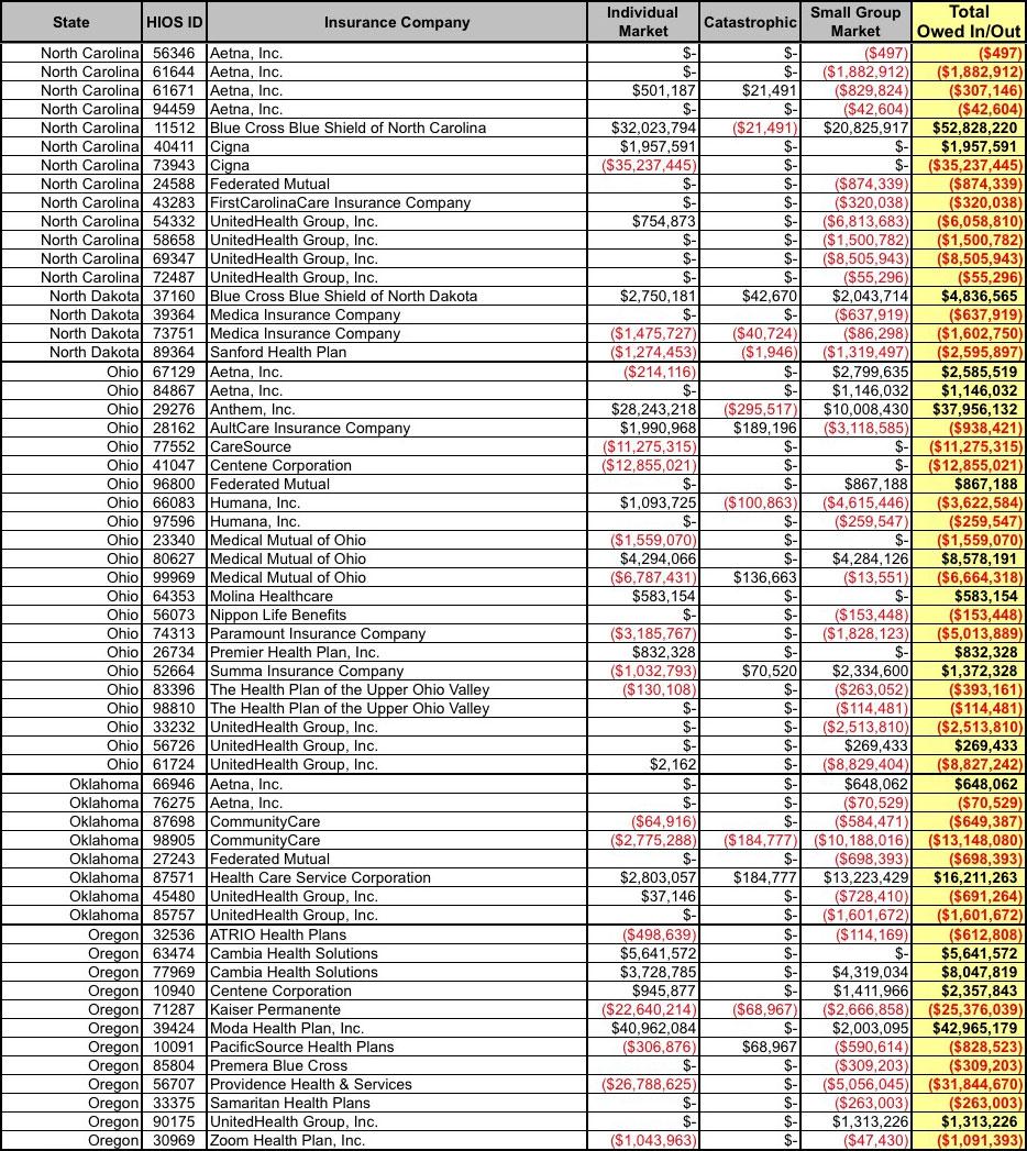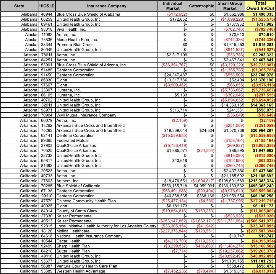 So, about an hour ago, CMS released the actual 2017 RA report itself, which lists (among other interesting info), exactly how much money insurance carriers in every state owe or are owed from last year. There are three categories: The Individual Market (Bronze, Silver, Gold & Platinum); the Catastrophic Individual Market; and the Small Group Market. the total amount of money involved is around $10.4 billion ($5.2 billion owed by carriers, $5.2 billion owd to carriers).