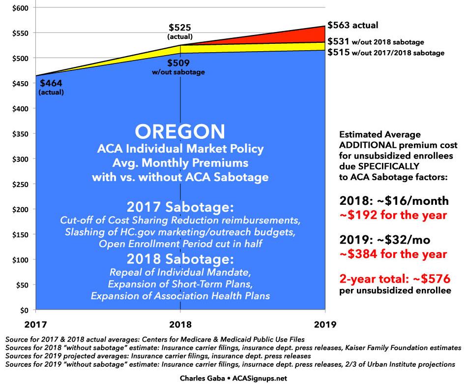 In 2019, average premiums in Oregon are expected to average around $563/mo, a $38/mo increase. As far as I can tell, about $32 of this is sabotage-generated.