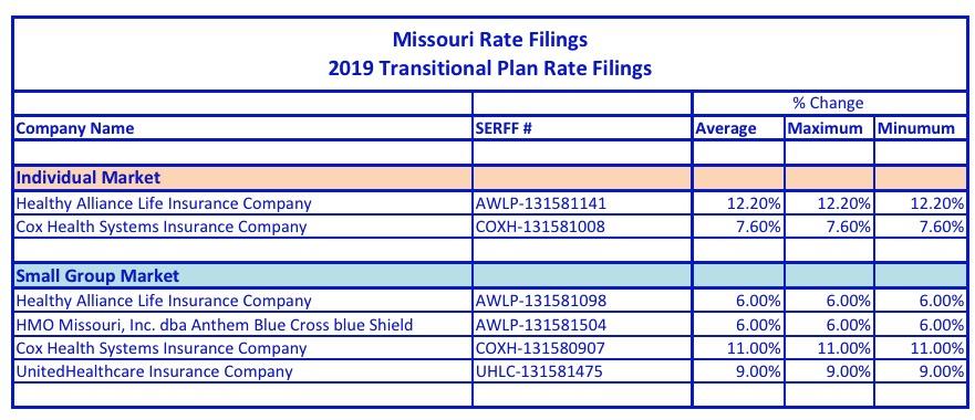 The Missouri Insurance Dept. has released preliminary 2019 rate filings for the individual and small group markets. Interestingly, in addition to the ACA compliant rate changes, they also posted transitional policy rate changes as well, which is unusual.