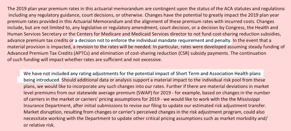 The Urban Institute projected that #MandateRepeal and #ShortAssPlans would add a 17.2 percentage point rate hike factor in Mississippi. I generally knock 1/3 off of their estimates to err on the side of caution (11.4%), but given Ambetter specifically stating that they didn't add any increase to account for #ShortAssPlans (why?? interesting!), I'm shaving off a bit more and assuming a flat 10% impact.