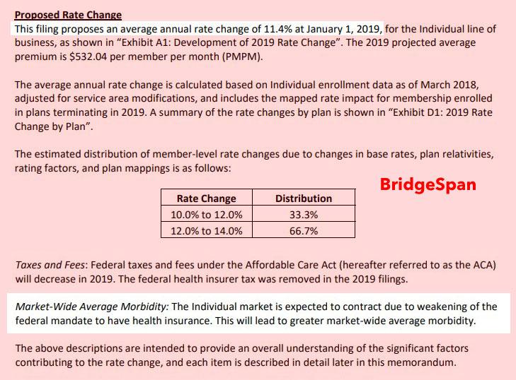 Having said that, there's one interesting extra sabotage factor to consider for the University of Utah rate filing: They note that they've added an extra 10.3% to their 2019 rates specifically tied to last year's Cost Sharing Reduction (CSR) cut-off. I presume they chose not to bake the CSR load into their rates this year, but I don't think Utah went the "mixed load" route so who knows?