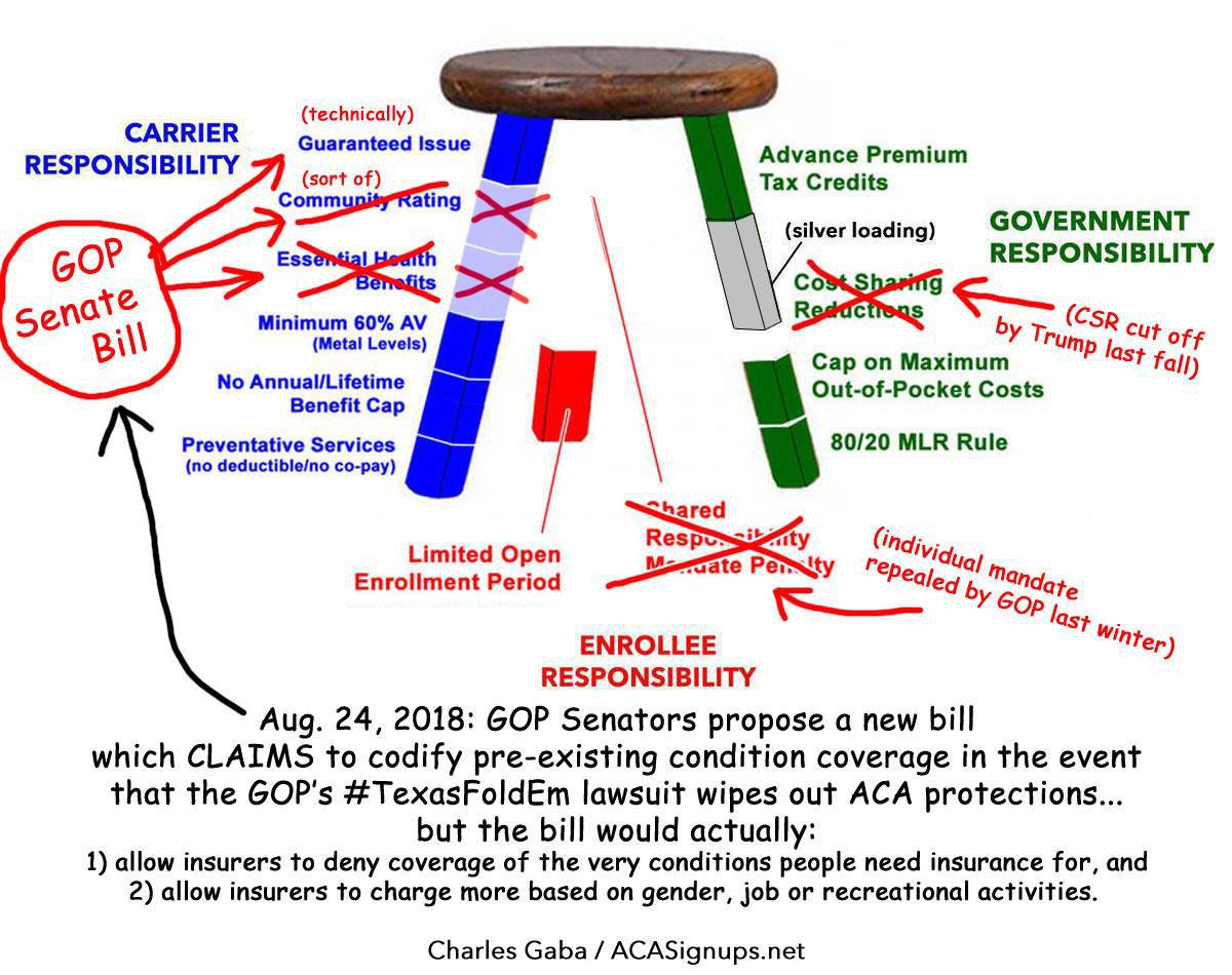 In response, Republican Senators Tillis, Alexander, Grassley, Ernst, Murkowski, Cassidy, Wicker, Graham, Heller and Barrasso have introduced a new bill which they claim would ensure pre-existing coverage protections. Unfortunately, it...doesn't.