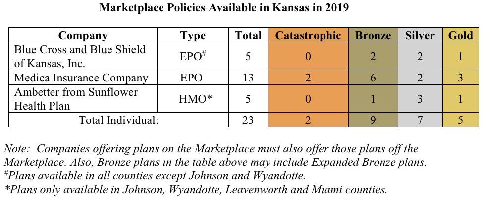 Policy Options for Individuals and Families In 2019 consumers shopping on the FFM in Kansas will have the opportunity to purchase individual policies offered by three health insurance companies depending on where they live. The companies include Blue Cross and Blue Shield of Kansas (103 counties); Medica Insurance Company (105 counties); and Ambetter from Sunflower Health Plan (4 Counties). There are 23 individual policies available on the Marketplace.