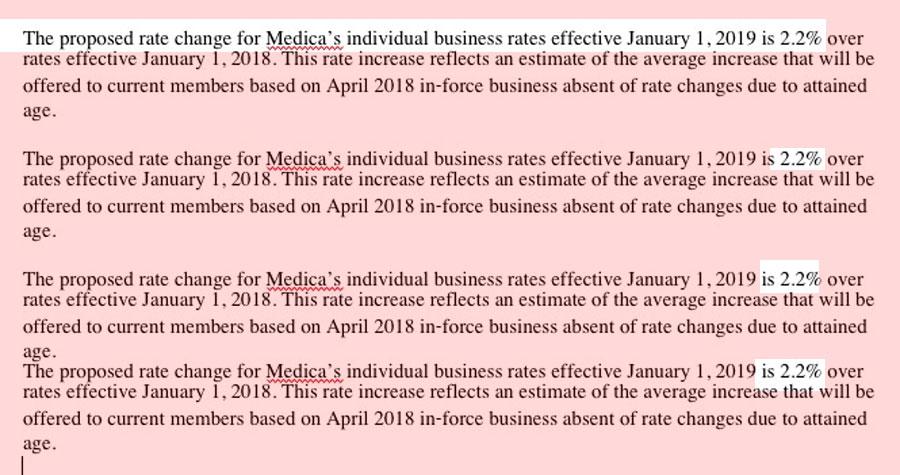 Nebraska has a slightly confusing siutation, which is surprising since Medica is the only carrier offering ACA policies in the state, When I first took a look at the requested premium changes for 2019 back in August, it looked like the average was around 1.0%...that was based on splitting the difference between the 3.69% and -2.60% listings, since the filing form was redacted and I didn't know what the relative market split was between Medica's product lines.