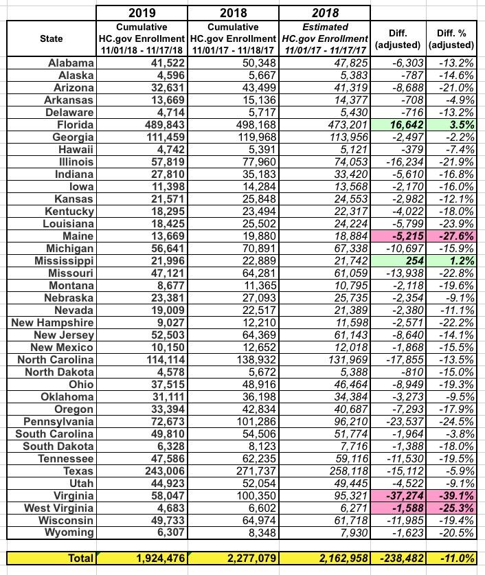 Adjusting for the 1-day difference however, HC.gov enrolled around 2.16 million people in the first 17 days last year, so the 2019 season is running around 11% cumulatively lower year over year for the first 17 days.