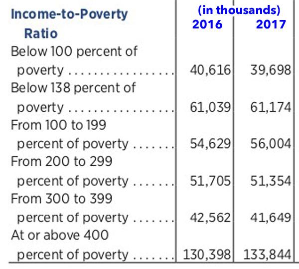 My friend and fellow healthcare wonk Andrew Sprung pointed me towards this 2017 U.S. Census Bureau report where it breaks the U.S. population down by household income bracket relative to the Federal Poverty Level (page 28):