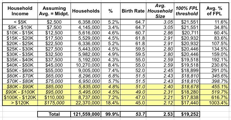 I have been able to roughly break out the average household size, by income level, based on different birth rates at income levels. Combining the link above with this excellent American Housing Survey database tool (again, a big shout-out to Andrew Sprung for the link!), I get the following: