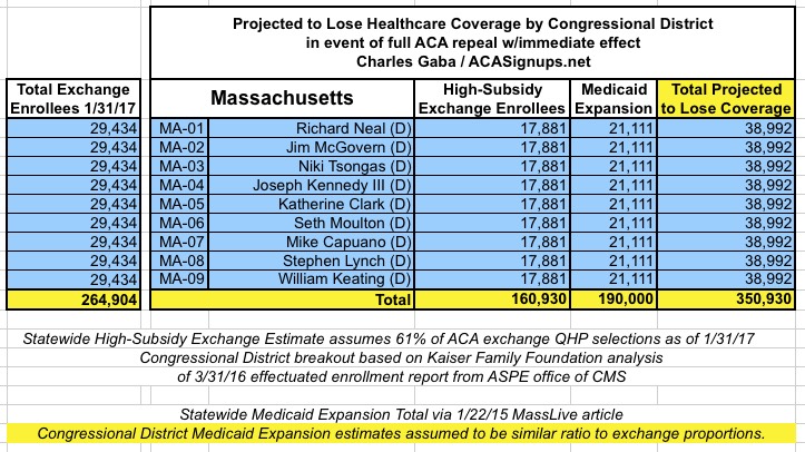 As for the Congressional District breakout, Massachusetts oddity is that the Kaiser Family Foundation analysis has all 9 Congressional Districts having the exact same number of exchange enrollees as of last March. Obvoiusly this isn't the case. KFF rounded each county off to the nearest 100, but it still seems unlikely that all 9 within the state would be that close (within +/- 50 people) regardless of the demographic/income similarities. However, in the absence of any other data sources, I have to use that as my basis...so as a result, my own estimates of both high- subsidy exchange enrollment and Medicaid expansion enrollment are also identical for each of the 9 CDs. Once again, if you have better data, pass it along and I'll update the tables, but in the meantime, this should be pretty close.