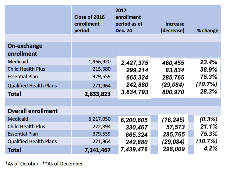...The reason for the discrepancy is that DOH’s release counted only sign-ups through the exchange, which handles less than half of the enrollment for the relevant programs. When off-exchange enrollment is included, the picture changes dramatically, as shown in the chart below.
