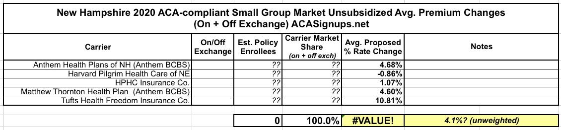 New Hampshire: *Preliminary* avg. 2020 ACA premium changes: 1.1% increase