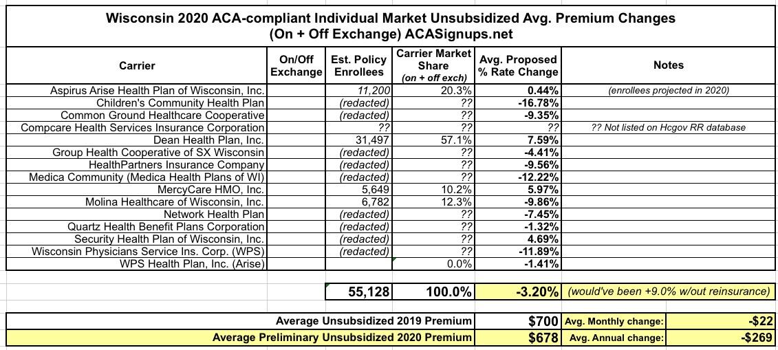 Unfortunately, the actual enrollment data for most of the carriers in Wisconsin is redacted, meaning I have no way of getting a total Individual Market size or the weighted average, although Gov. Evers already notes that it's a 3.2% reduction in his press release: