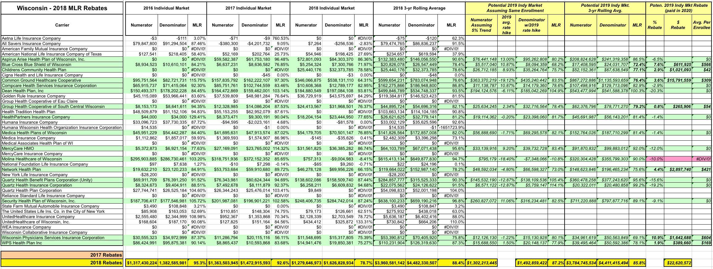 MLR rebate payments for 2018 are being sent out to enrollees even as I type this. The data for 2018 MLR rebates won't be officially posted for another month or so, but I've managed to acquire it early, and after a lot of number-crunching the data, I've recompiled it into an easy-to-read format.