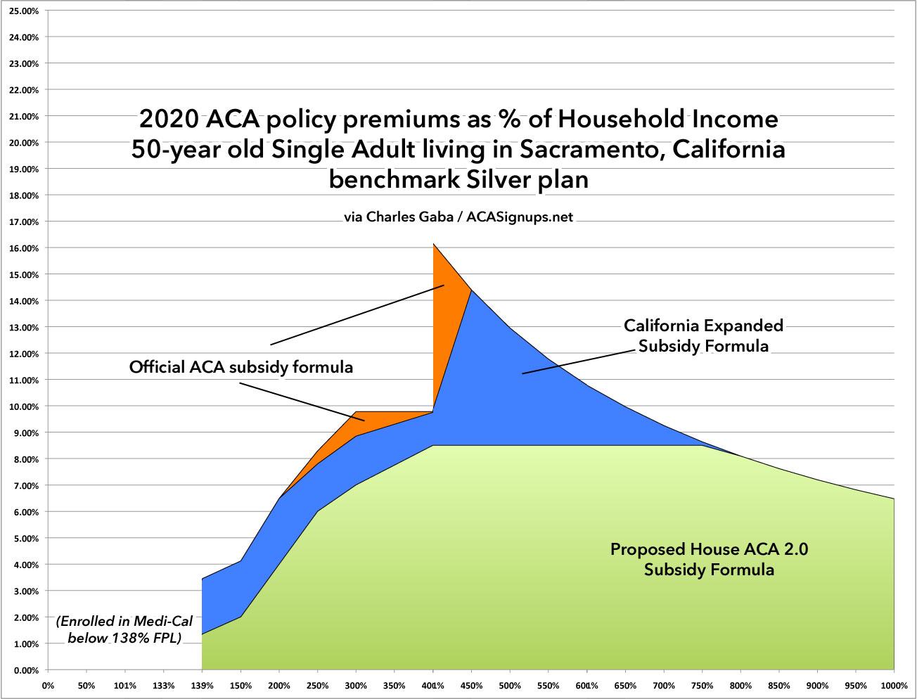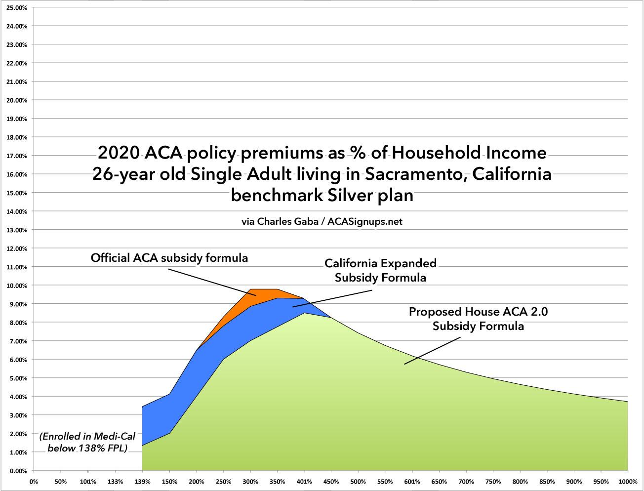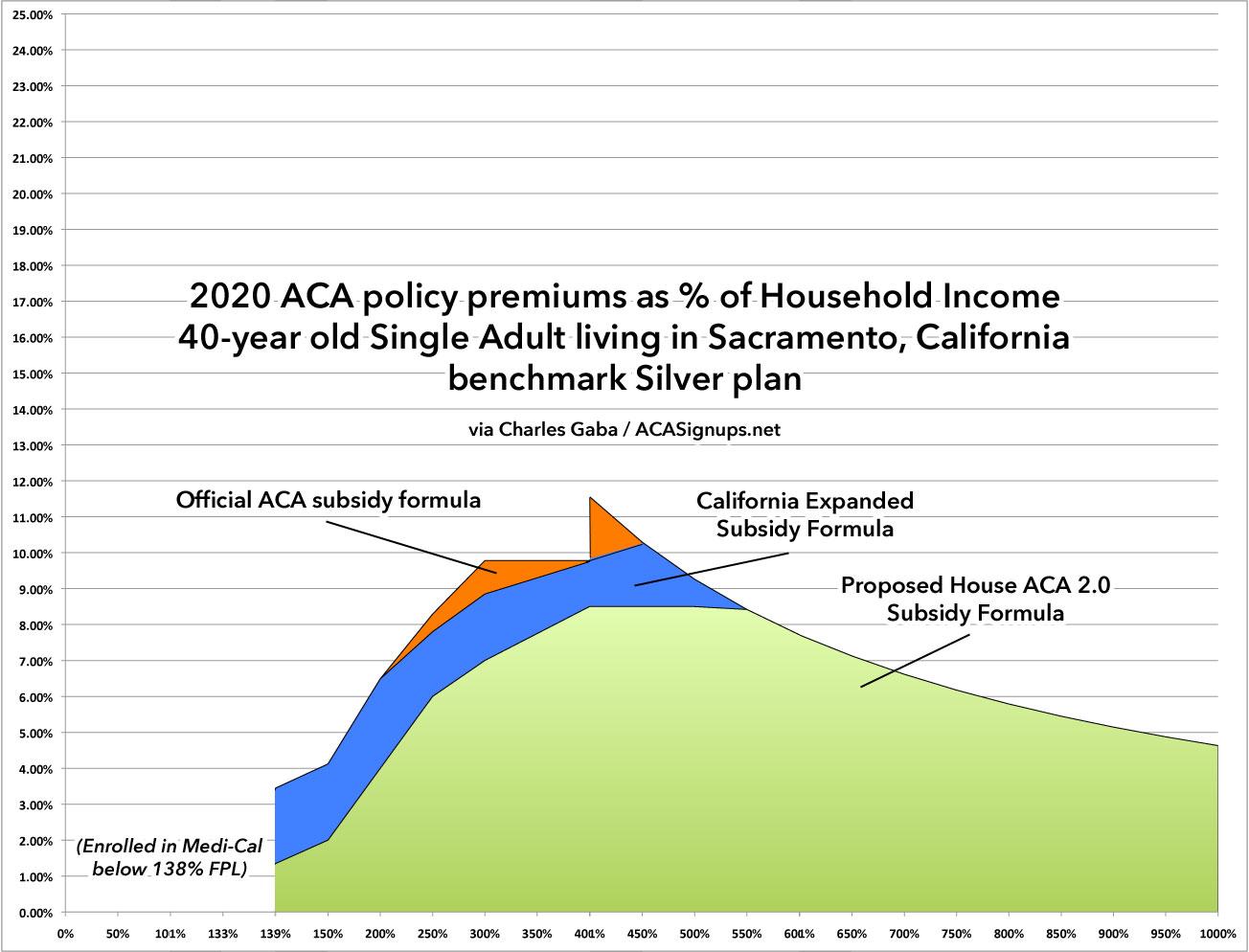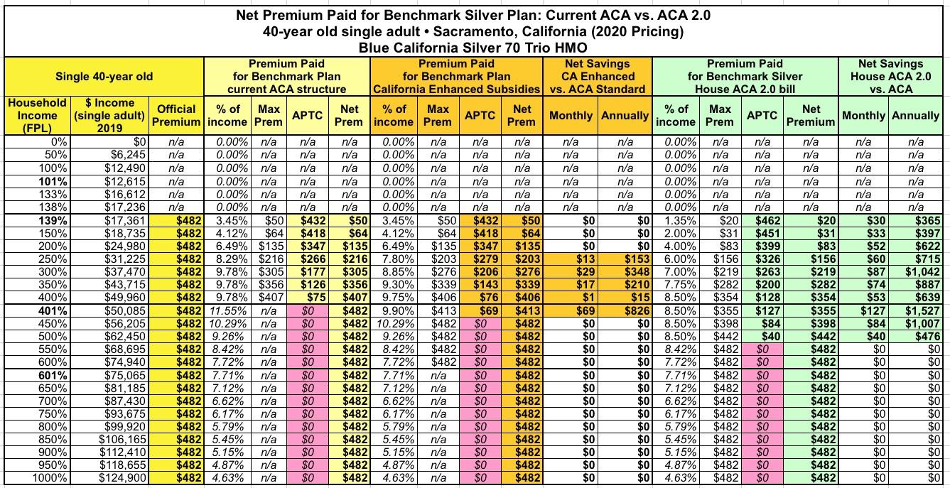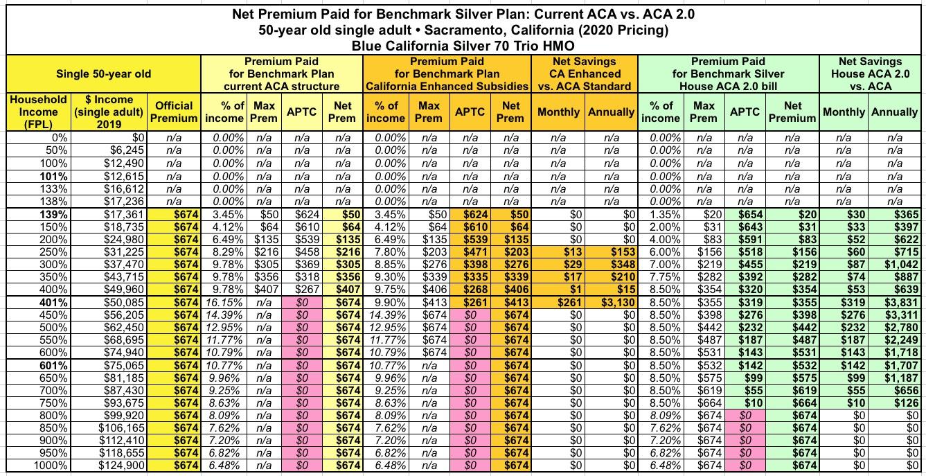 I've also included a third overlay on the tables below: The federal House Democrats ACA 2.0 bill (either H.R. 1868 or H.R. 1884), which would cap premiums at no more than 8.5% of income. The official ACA formula is in Manilla; the California subsidy formula is in Orange, and the proposed ACA 2.0 structure is in Green.