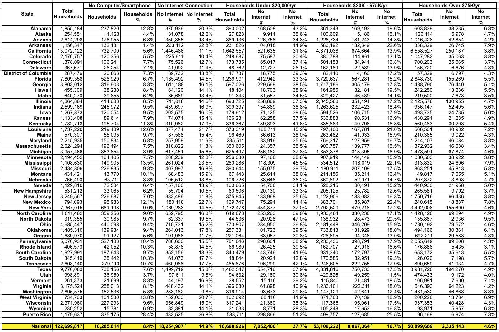 One bit of good news is that the 13% national figure is a 5-year average; obviously a lot has changed tech-wise over the past few years. According to the 2018 one-year ACS estimates, this figure was down to 8.4% last year. Here's a breakout of the numbers and percentages by state: