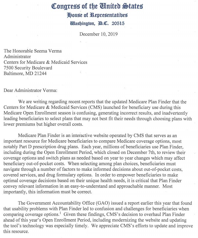 "It is critical that Medicare beneficiaries have the most accurate and up-to-date information and that Medicare provides them with reliable information on their health care costs and coverage information relevant to their needs," the bipartisan members wrote to Administrator Verma. "Understanding cost-sharing obligations when selecting plans is especially critical for seniors who take prescription medications that often can have costly coinsurance, tiering, and co-payment requirements."
