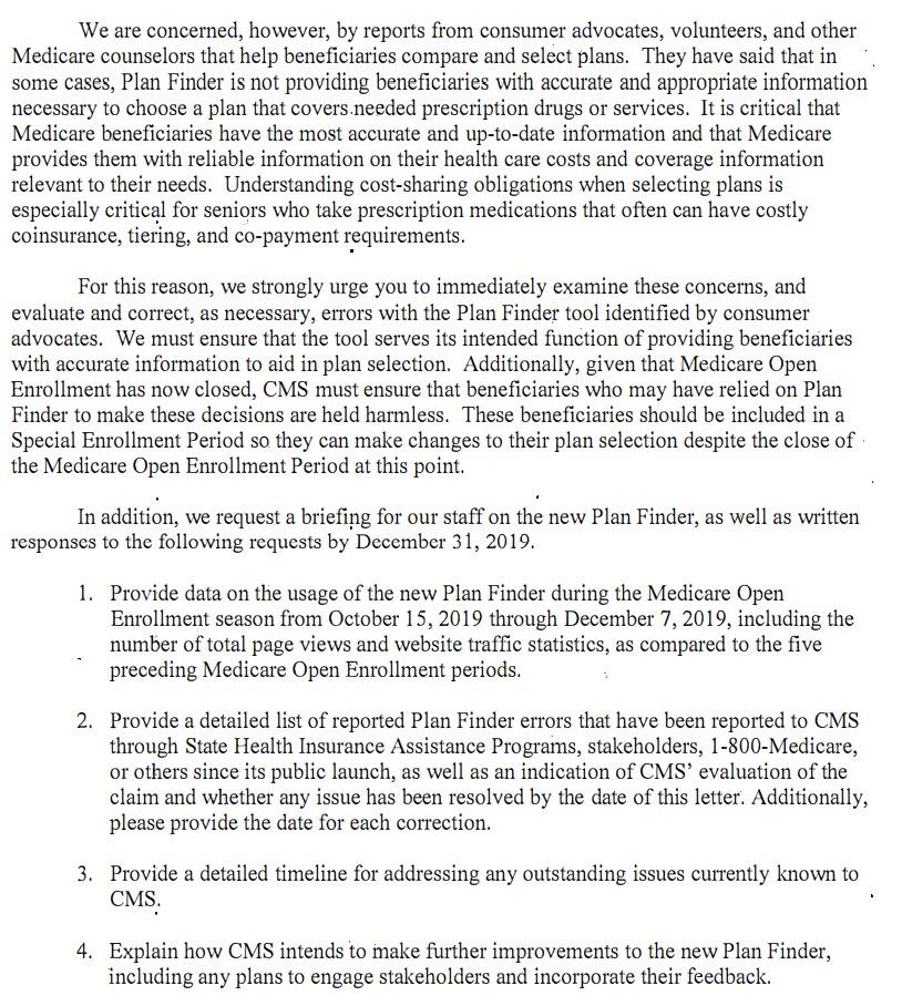 "We strongly urge you to immediately examine these concerns, and evaluate and correct, as necessary, errors with the Plan Finder tool identified by consumer advocates," Pallone, Walden, Neal and Brady continued in their letter. "Additionally, given that Medicare Open Enrollment has now closed, CMS must ensure that beneficiaries who may have relied on Plan Finder to make these decisions are held harmless. These beneficiaries should be included in a Special Enrollment Period so they can make changes to their plan selection despite the close of the Medicare Open Enrollment Period at this point."