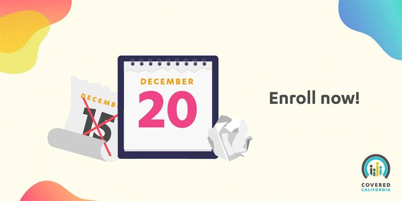 California’s open-enrollment period continues through Jan. 31, 2020, but people who enroll after Dec. 20 will have their coverage start Feb. 1.