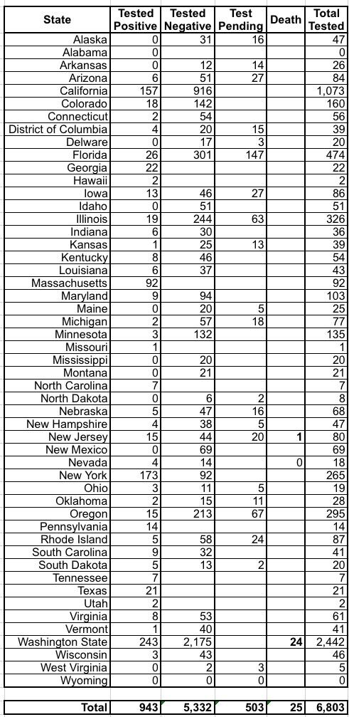 This seems to be the best and really only source of information I’ve seen with detailed and frequently updated data on the rate of COVID-19 testing and infections broken down by states within the United States. This is the breakdown by states. This is the daily cumulative update. In each case you have total tests, positives, negatives and pending. In a better world, the CDC or some other government agency would be publishing this information. But that’s not happening.