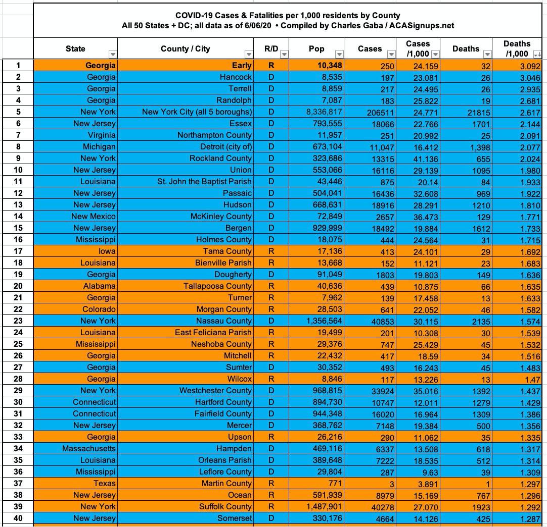 Here's the top 40 counties ranked by per capita COVID-19 fatalities as of Saturday, June 6th: