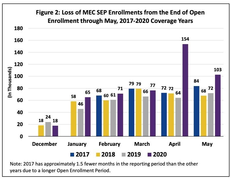 - The number of consumers gaining Exchange coverage through the loss of MEC SEP dropped by about one-third from April 2020 to May 2020, but continued to be significantly higher— by 43 percent—than in May of 2019.
