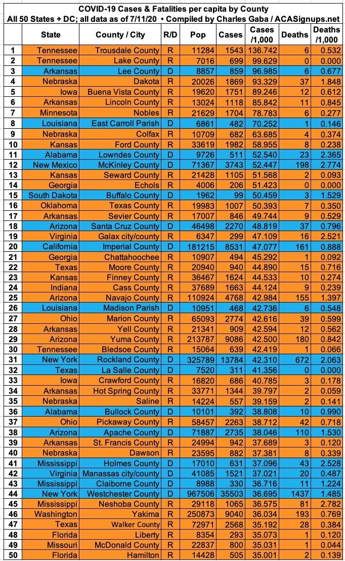Here's the top 100 counties ranked by per capita COVID-19 fatalities as of Saturday, July 18th (click image for high-res version):