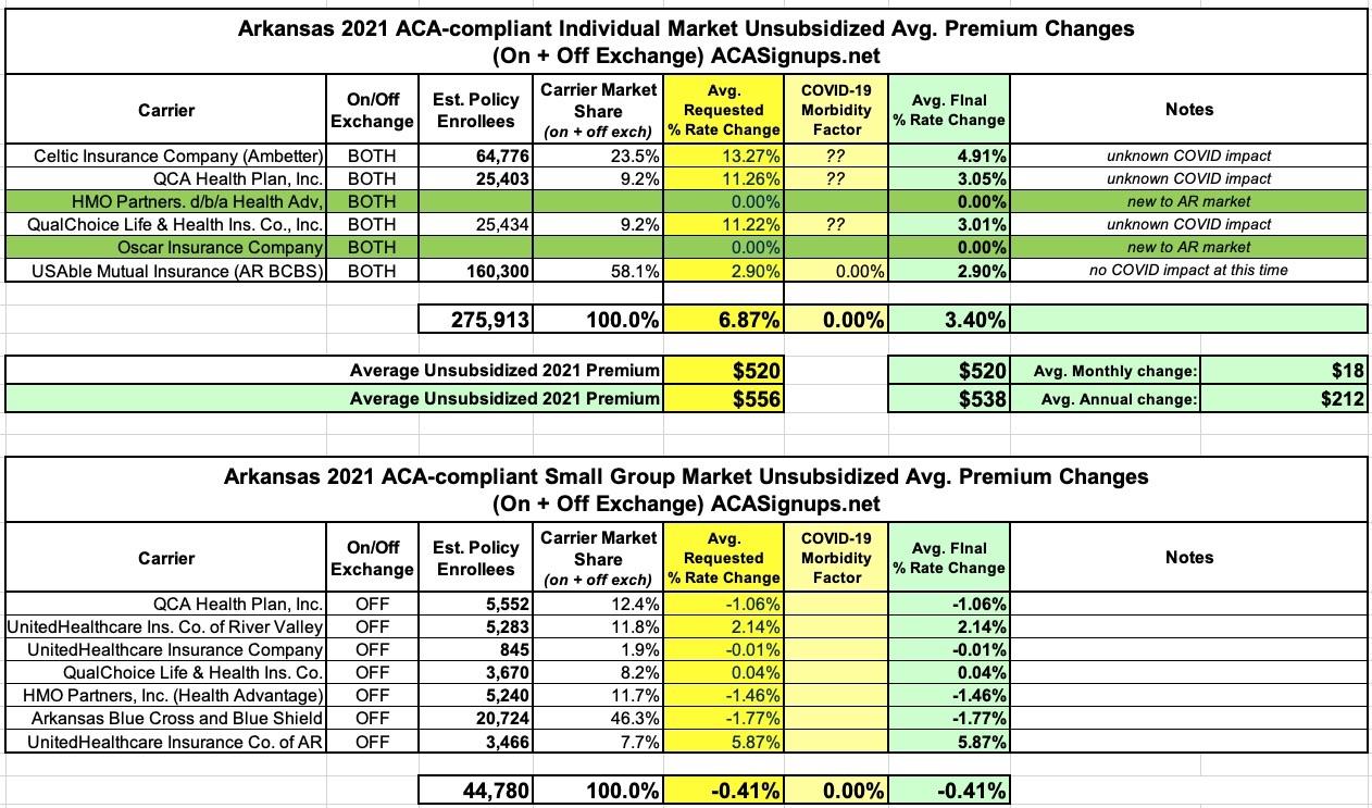 Arkansas: Approved avg. 2021 #ACA rate changes: +3.4% indy market, -0.4% sm. group market