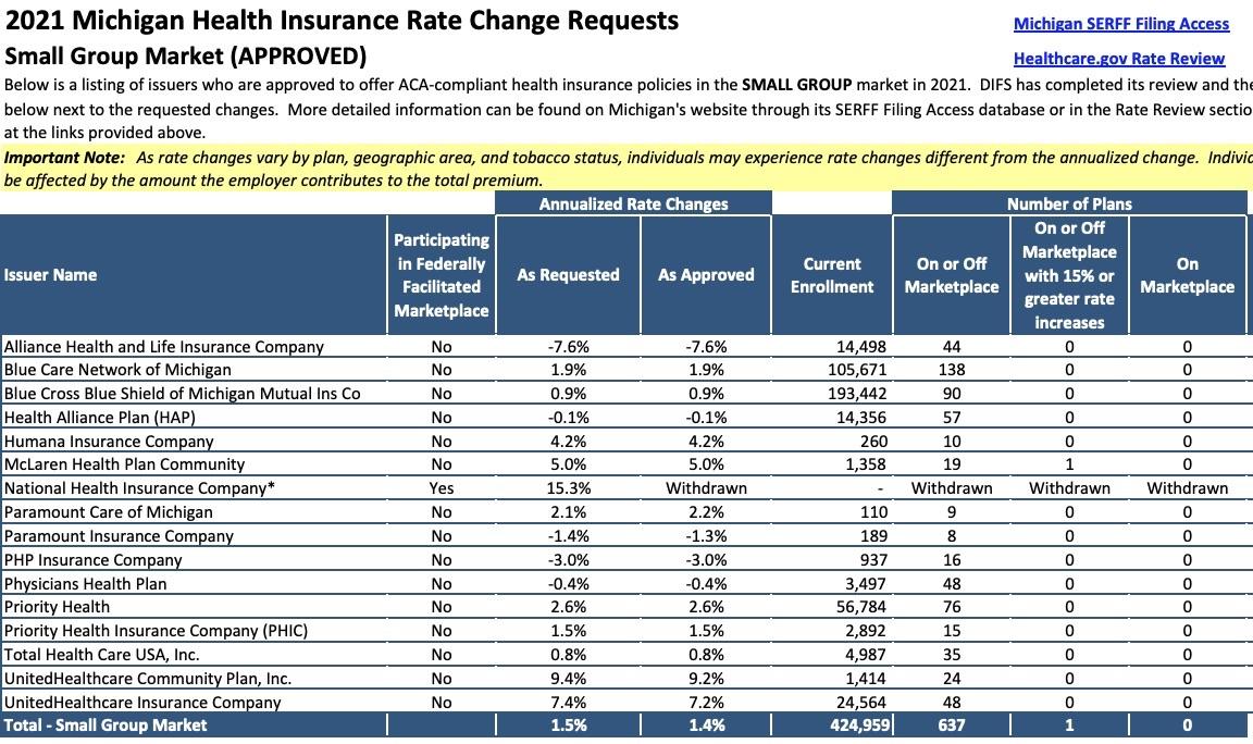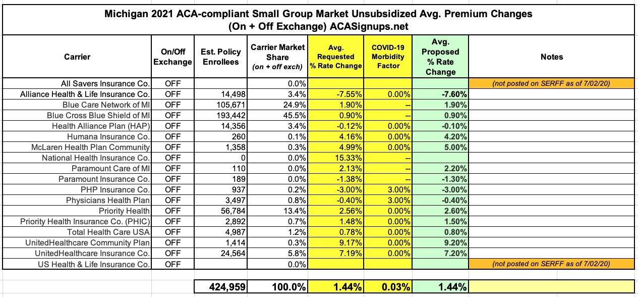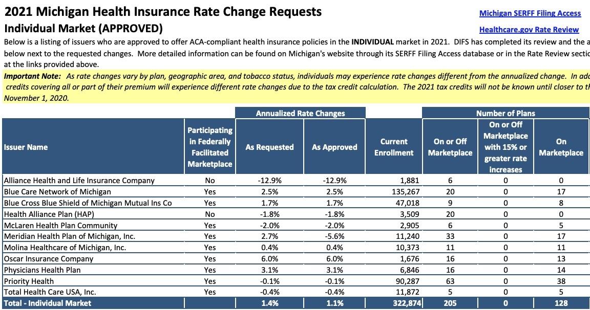 Way back in July (a lifetime ago!), Michigan's Dept. of Financial Services posted the state's preliminary 2021 individual & small group rate filings. At the time, the average premium changes being asked for were around a 1.3% increase on the individual market and 1.4% on the small group market.