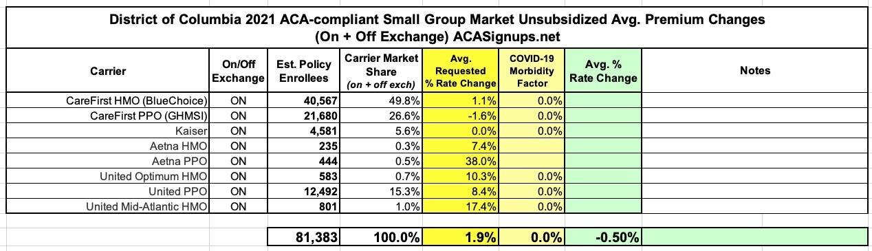 District of Columbia: *Approved* avg. 2021 ACA rate change: +0.2%; -0.5% for sm. group