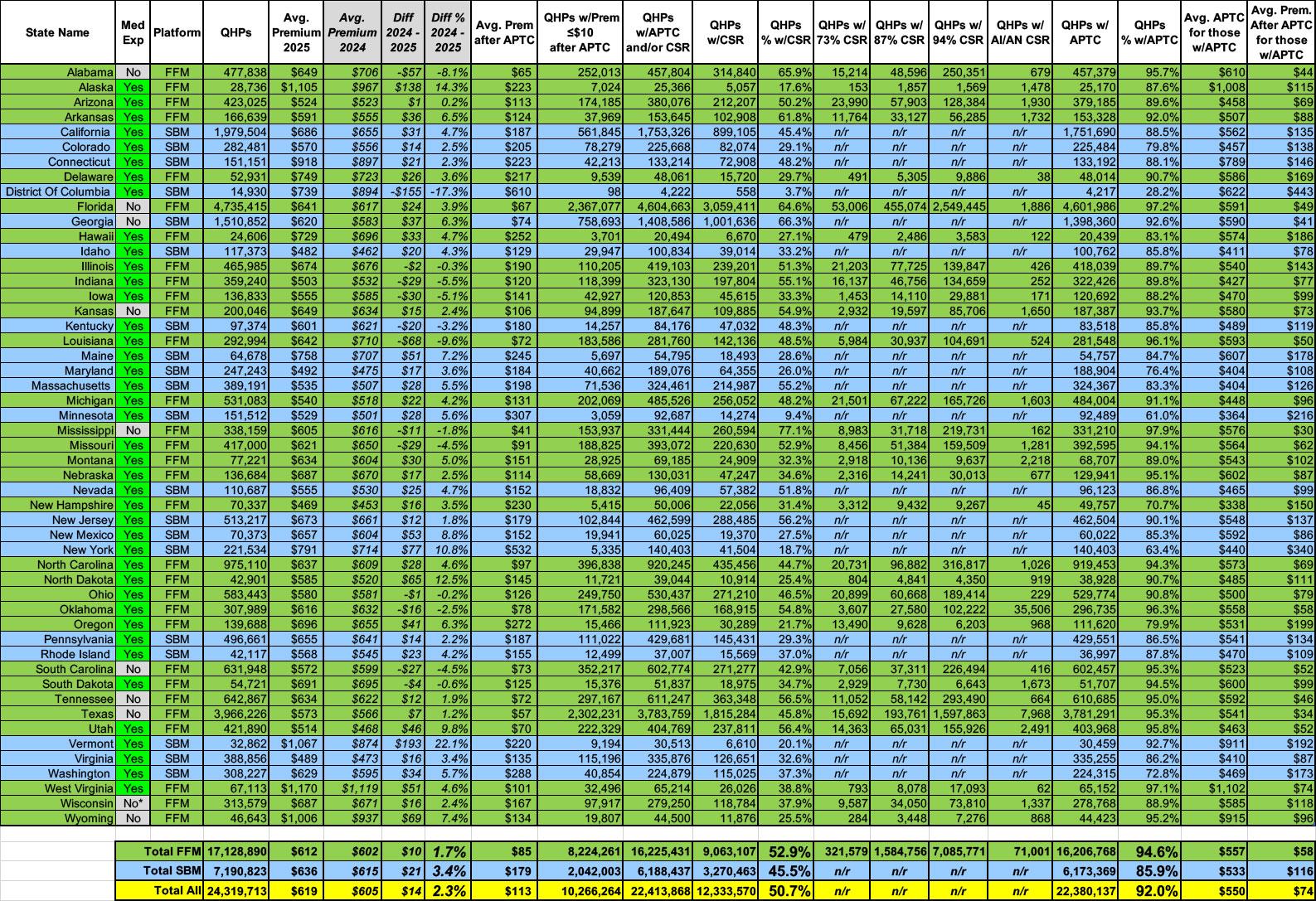 This is a noteworthy because 2025 ACA exchange premiums "should" have increase by more like 6-7% on average. This discrepancy is mostly because that 6-7% assumed that 100% of those enrolled in each plan in 2024 renewed the exact same policy (without any attrition or additional enrollment), which of course is never the case...even if total QHP selections were identical year over year, not all of the enrollees would be the same people, millions of them would switch to different policies and so on.