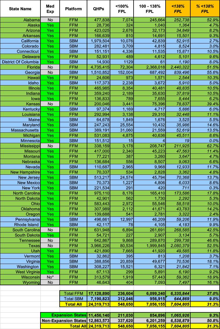 Since there's so many income bracket columns and there's a lot to delve into for many of them, I've broken the full spreadsheet out into three sections/posts. The first focuses on exchange enrollees who earn less than 138% of the Federal Poverty Level (FPL). This is a critical threshold because it's the cut-off point for ACA Medicaid expansion enrollment in the 40 states (+DC) which have expanded it.