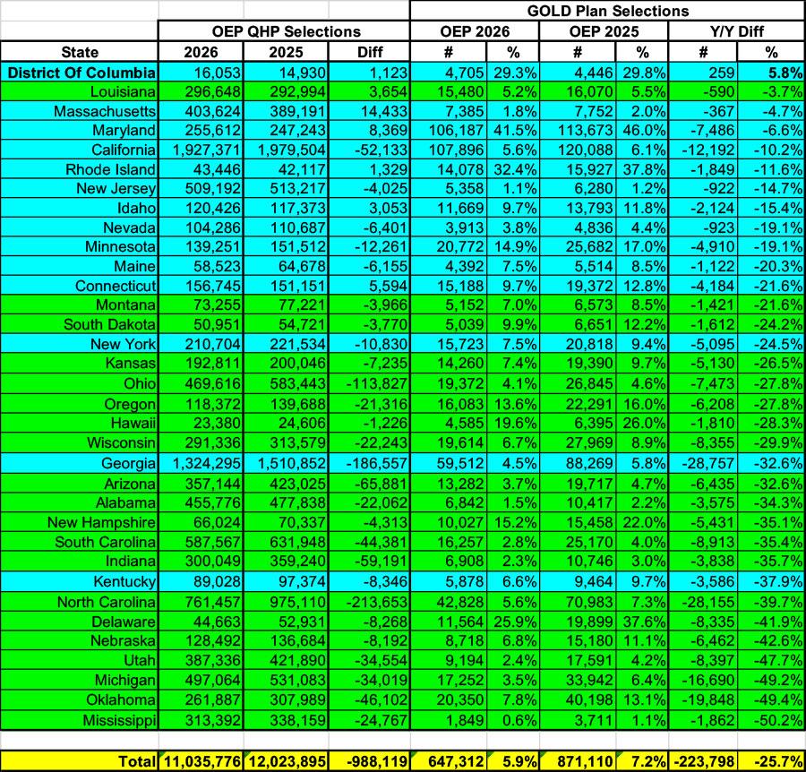 So, what's the deal with those ~770K who upgraded? Well, that's where Silver Loading & Premium Alignment once again come to the rescue. But first, let's take a look at the data. Here's 2026 Open Enrollment Period GOLD plan selections by state, sorted by how much they increased or decreased year over year on a percentage basis: