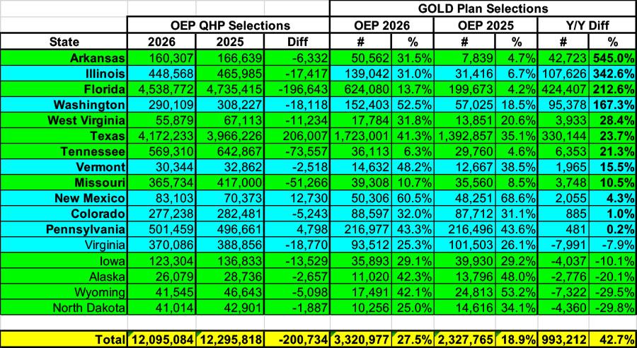 As you can see, using KFF's data seems to be a better way to go...they have 17 "likely Premium Alignment" states, of which 12 really did see increases in Gold enrollment this year, including the two biggest ones I missed: Tennessee and especially Florida.