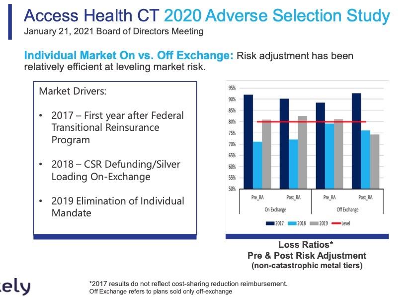 • Loss Ratios after consideration of risk adjustment transfers indicates that on exchange enrollees are currently not financially disadvantaged.