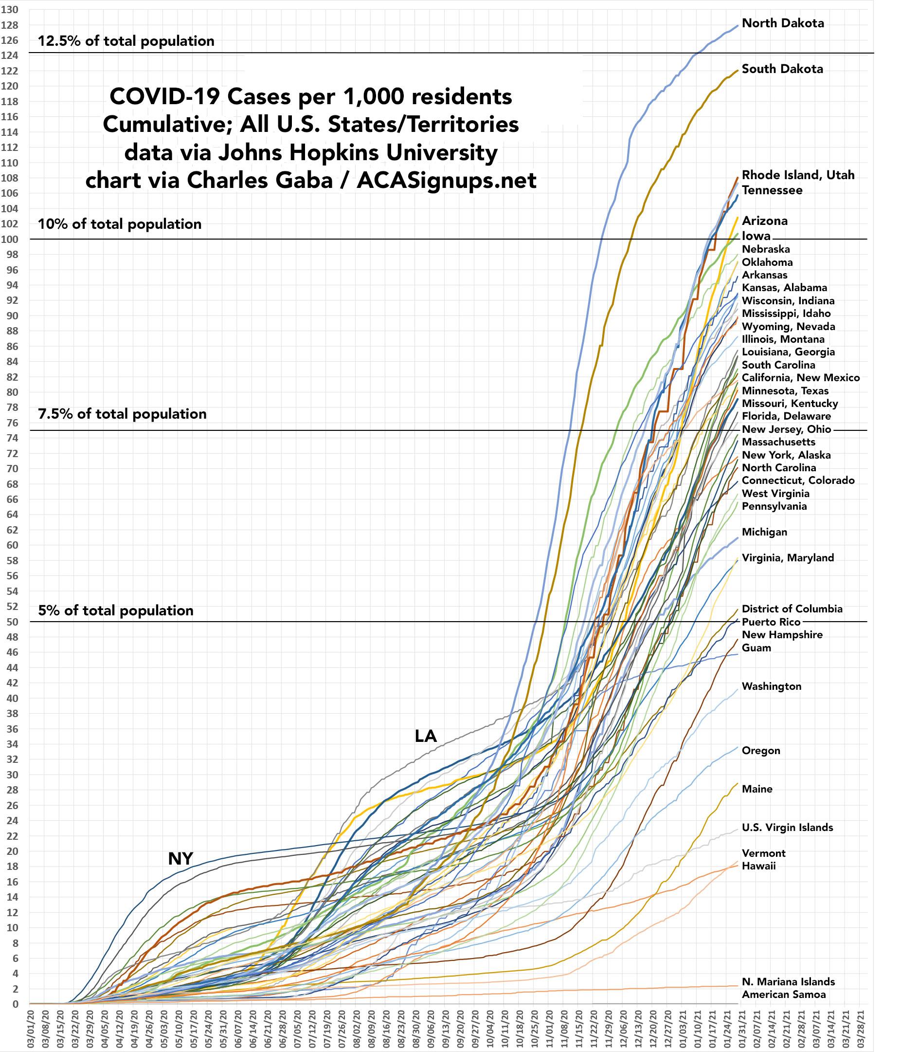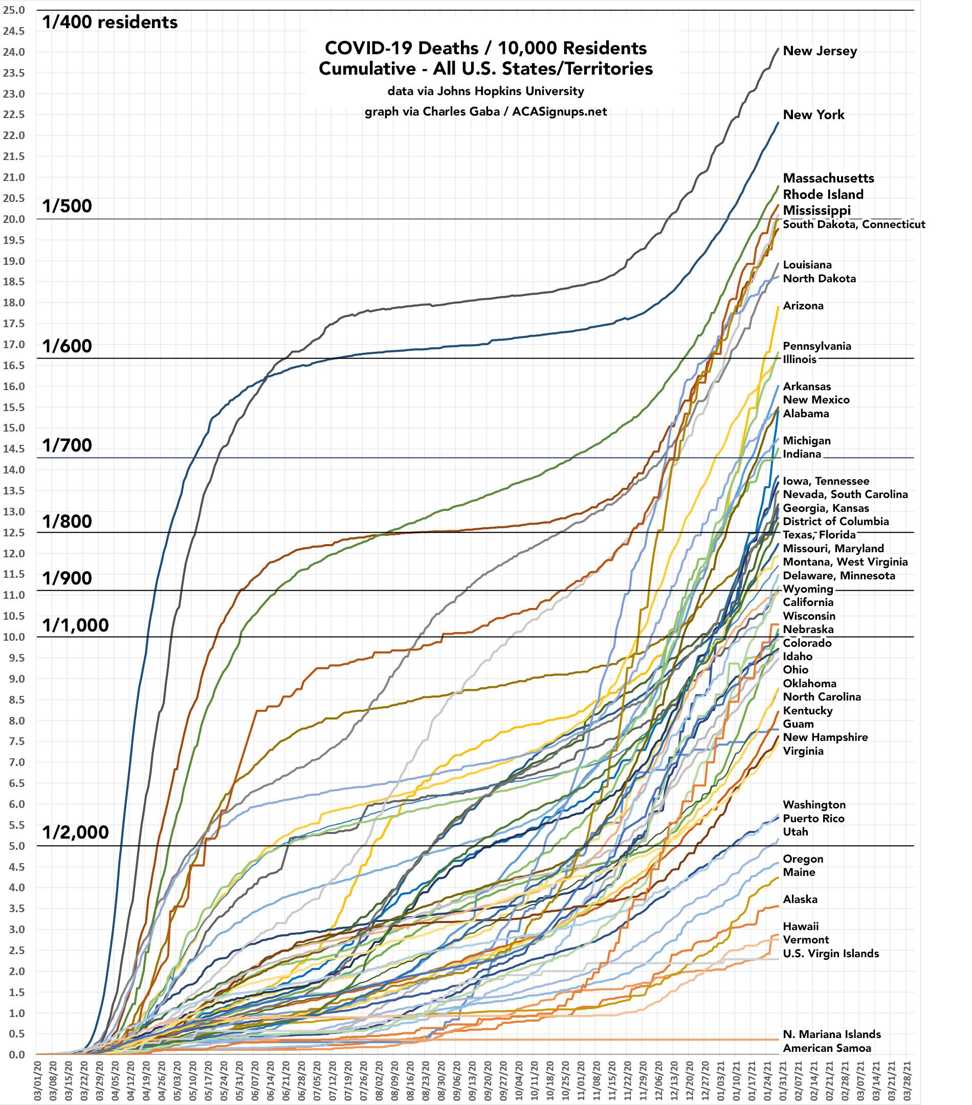 I've done my best to label every state/territory, which obviously isn't easy to do for most of them given how tangled it gets in the middle. For cases per capita, the most obvious point is that New York and New Jersey, which towered over every other state last spring, are now utterly dwarfed by North & South Dakota, although things are getting pretty horrible everywhere now.
