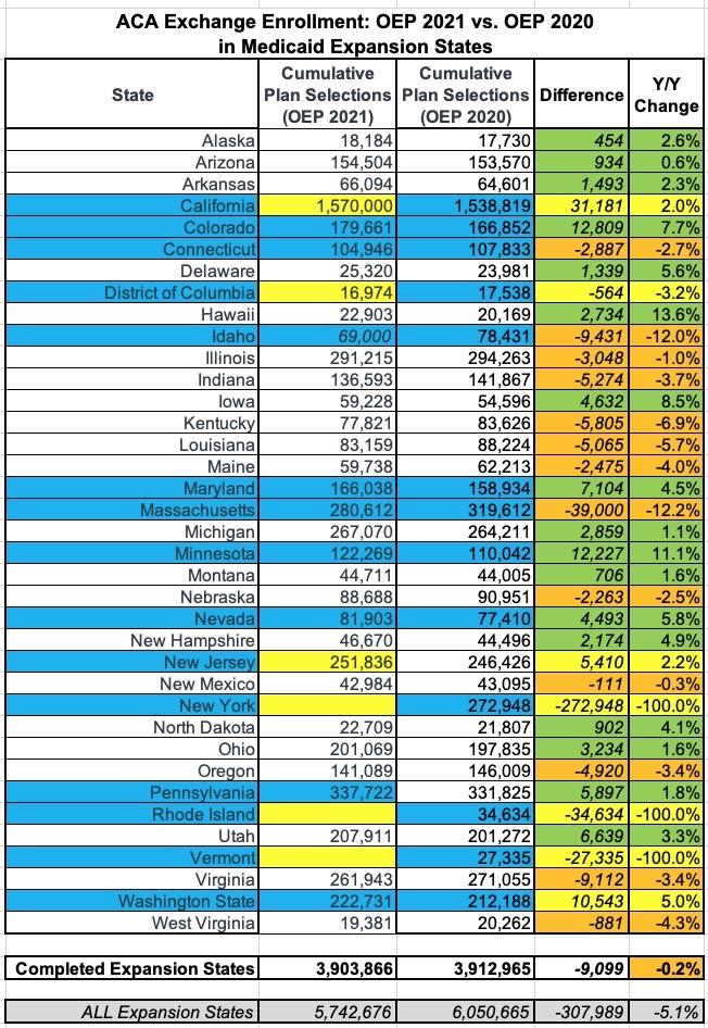 If you only include the states which have reported their final 2021 OEP data, they're running 0.5% behind last year. Again, Medicaid expansion and the disenrollment freeze almost certainly accounts for most of this...but notice that the only other state close to Massachusetts is Idaho. After that, the next-highest drops are Kentucky at 6.9% and Louisiana at 5.7%.