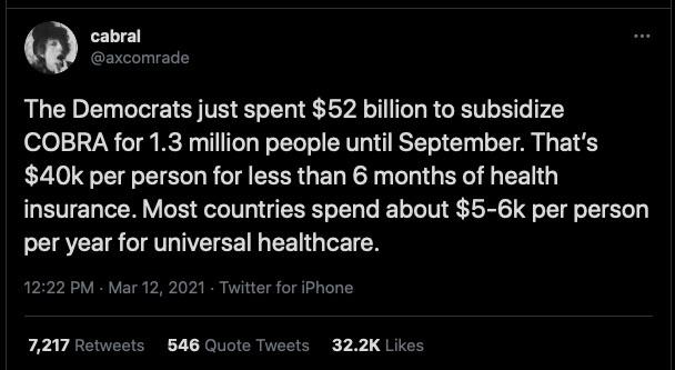 The Democrats just spent $52 billion to subsidize COBRA for 1.3 million people until September. That’s $40k per person for less than 6 months of health insurance. Most countries spend about $5-6k per person per year for universal healthcare.