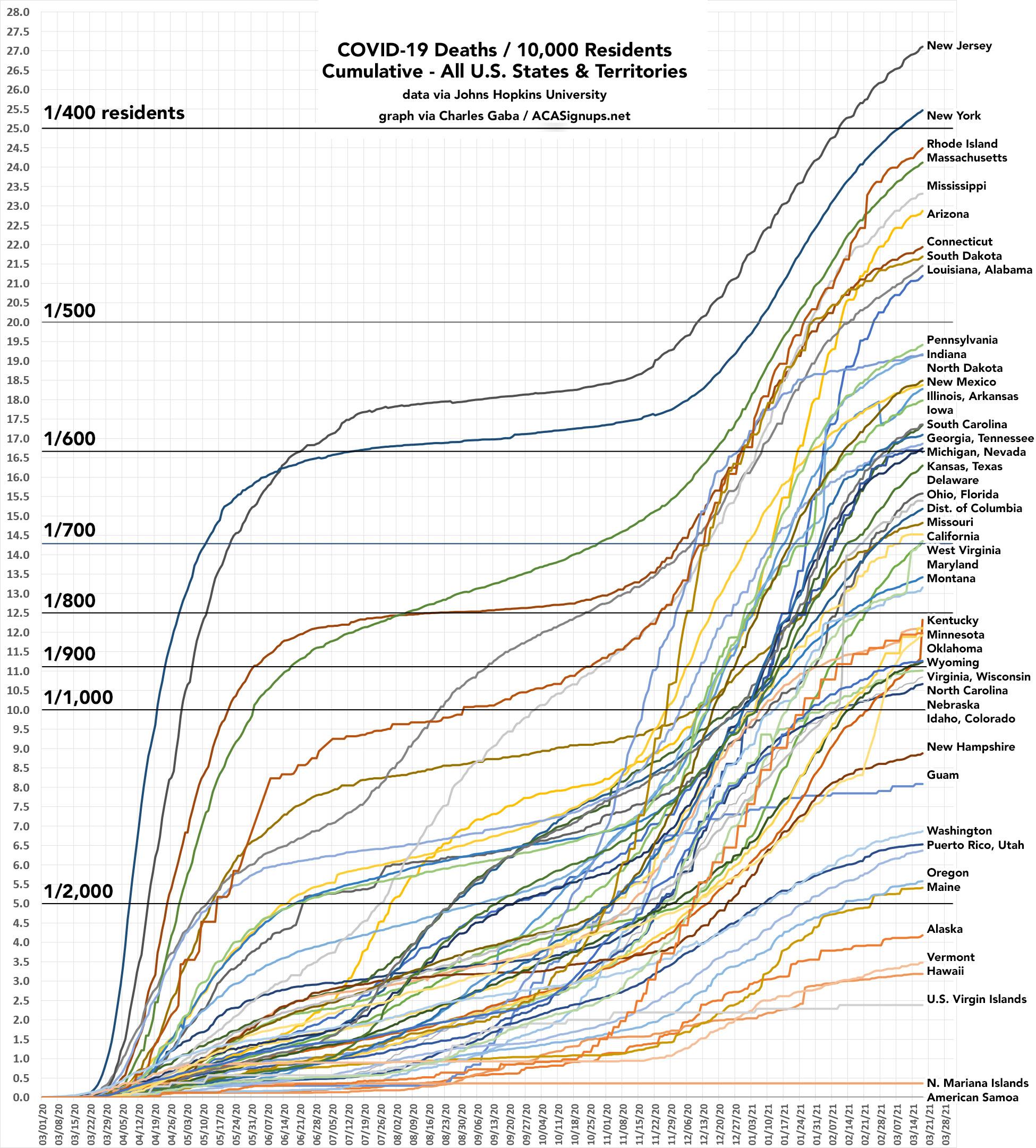 Next, let's look at the cumulative mortality rate for every U.S. state and territory. Here, New Jersey and New York are still worse than the rest of the country (primarily due to their mass deaths from March - May last spring)...but as you can see, several other states are, tragically, also catching up to them on this front as well.