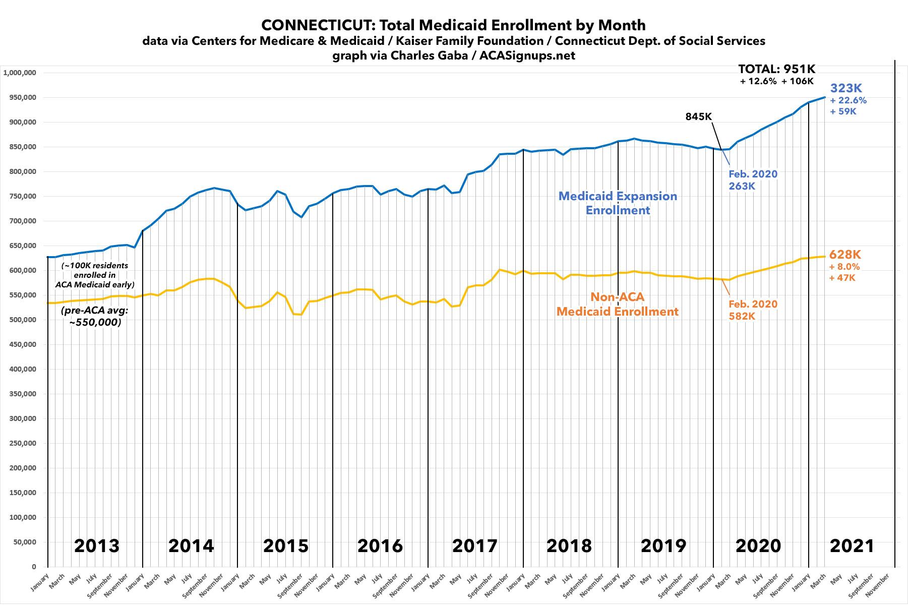 Today I'm presenting Connecticut, where Medicaid enrollment averaged around 650,000 residents prior to ACA expansion...except that included up to 100,000 who were added to the Medicaid tally early via special arrangements between the state and the Centers for Medicare & Medicaid Services.