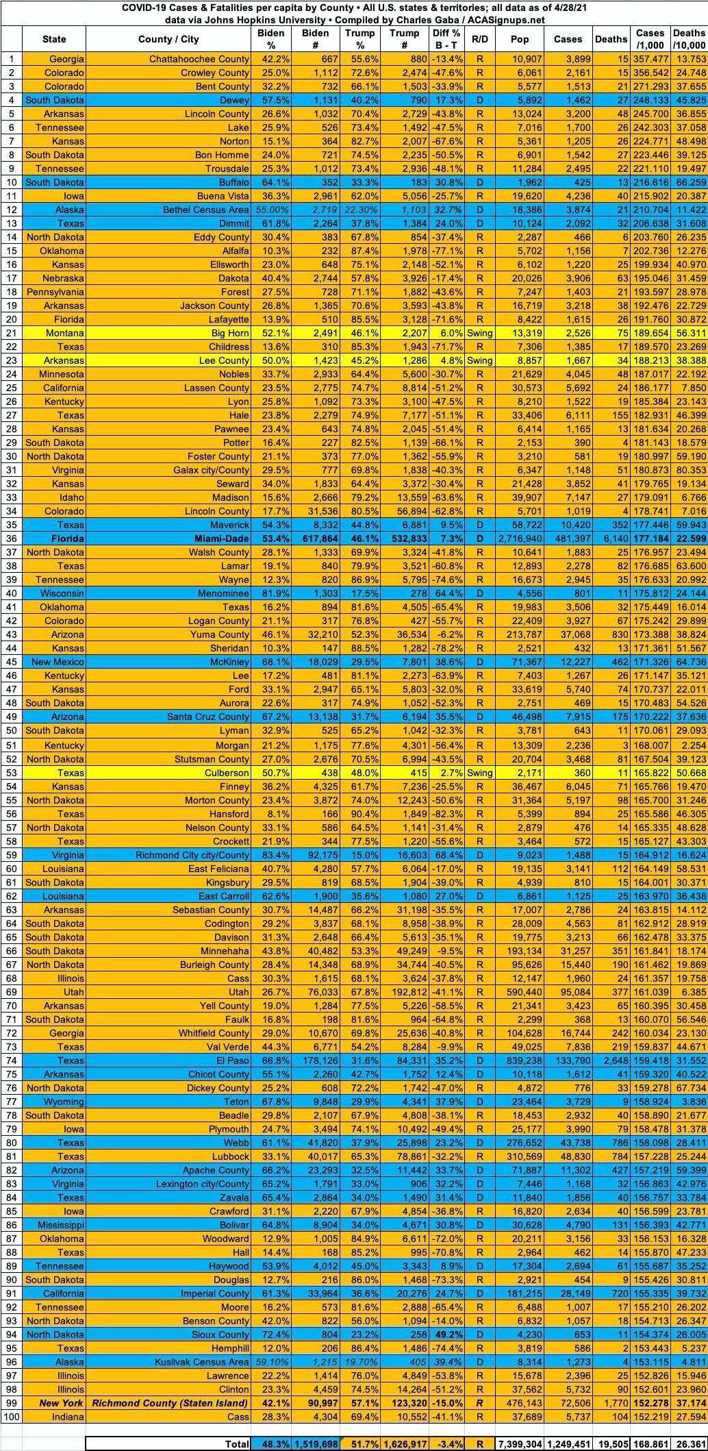 Here's the top 100 counties ranked by per capita COVID-19 fatalities as of Wednesday, April 28th, 2021 (click image for high-res version):