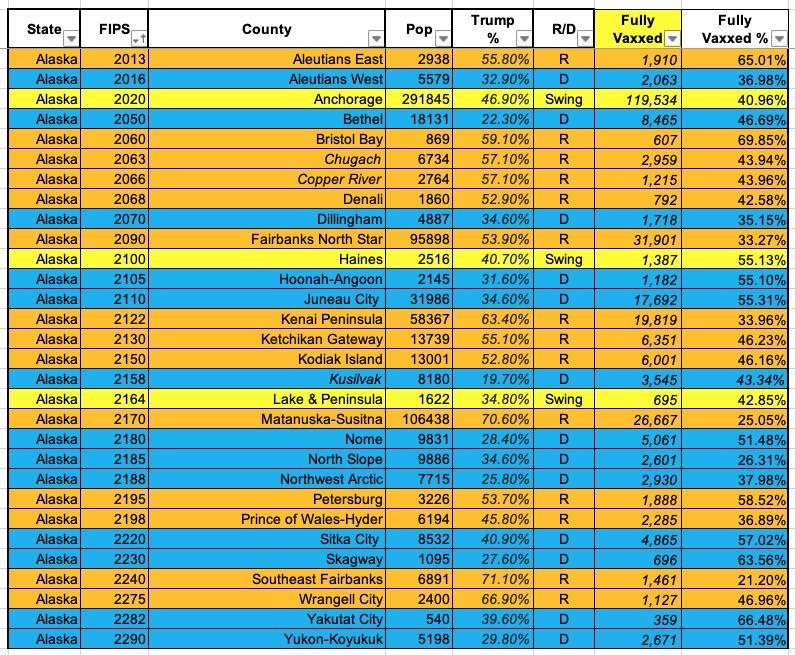 - The Valdez-Cordova Census Area doesn't even exist anymore; apparently it was split into two new Census Areas called Chugach and Copper River. I'm assuming the vaccination split is roughly equivalent to their population split (thus giving them identical vaccination percentages), but I could be wrong.