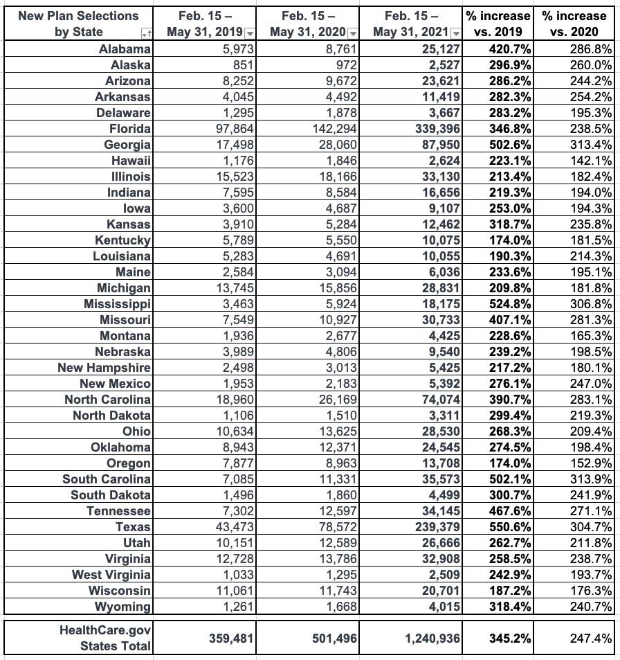 All in all, I've confirmed that at least 1,090,631 more people have enrolled via the Special Enrollment Period nationally...and even then, most of that data only runs through the end of April. I strongly suspect that HealthCare.Gov SEP enrollment was over 1.2 million by the end of May (in fact, President Biden may have even let this slip in his Weekly Address video with President Obama over the weekend). On top of that, I suspect total SEP enrollment across the 15 state-based exchanges is more like 400,000, bringing the SEP total as of the end of May up to 1.6 million or so nationally.