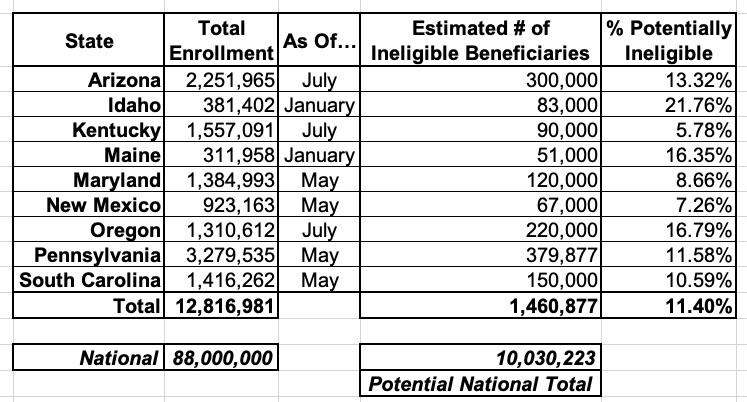 Obviously Medicaid enrollment and eligibility levels vary greatly from state to state, so I don't know how representative these 9 are, but it suggests that at least 10 million Americans could get the boot from Medicaid and/or CHIP programs sometime early next year, or over 11% of the total nationally. Some estimates put the national total as high as 15 million.