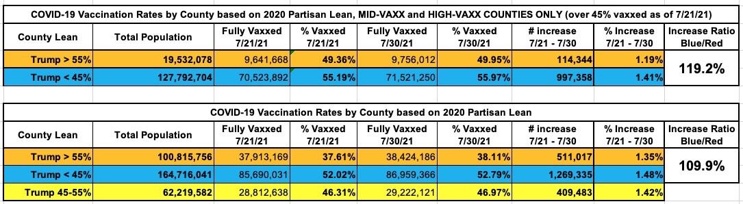 On July 21st, I noted there were 146 low-vaxx Blue counties with 36.9 million residents and 2,103 low-vaxx Red counties with 81.3 million residents which fell below the 45% vaccination threshold.