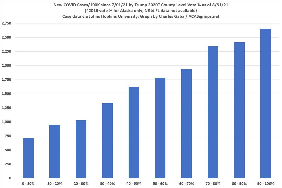 UPDATE: Earlier today, Christopher Ingraham of The Why Axis posted a piece about this very topic called, quite simply, "GOP Covid Policy is killing GOP voters." It mostly covers the same ground I have in this and prior pieces, but it also includes another graph which illustrates the point even better than my bubble graphs do. He groups most of the U.S. population into 5 brackets based on how much of the vote Trump got last year (0 - 20%, 20 - 40%, etc), with vertical bars showing the COVID death rate since July 31st in each group.