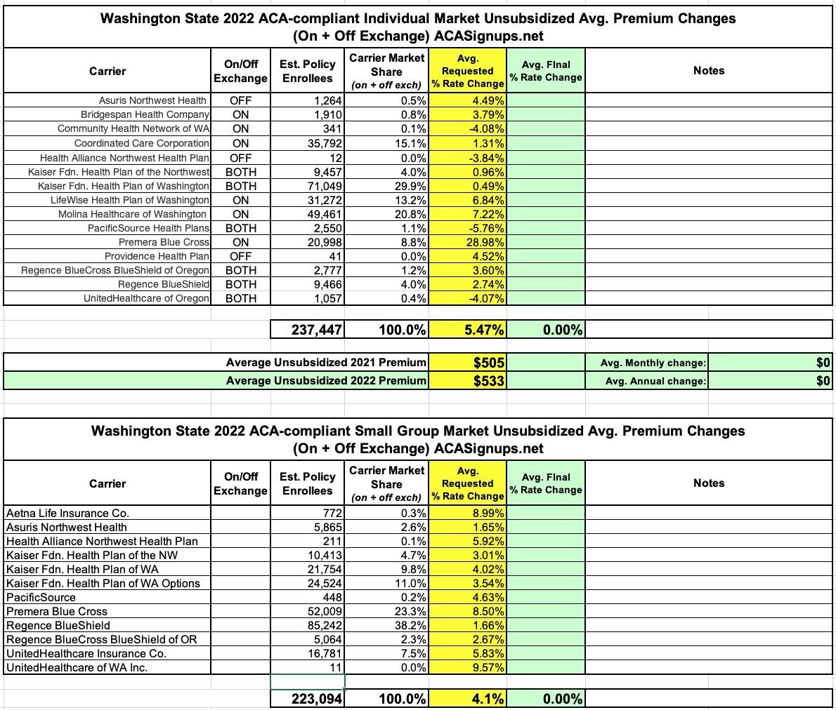 Washington State: Preliminary avg. 2022 premium rate changes: +5.5% indy market, +4.1% sm. group