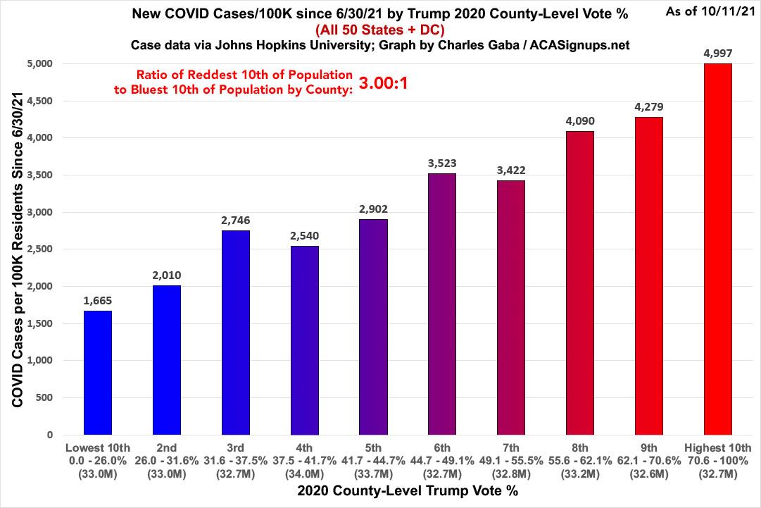 Since Delta began circulating widely in the U.S., Covid has exacted a horrific death toll on red America: In counties where Donald Trump received at least 70 percent of the vote, the virus has killed about 47 out of every 100,000 people since the end of June, according to Charles Gaba, a health care analyst. In counties where Trump won less than 32 percent of the vote, the number is about 10 out of 100,000.