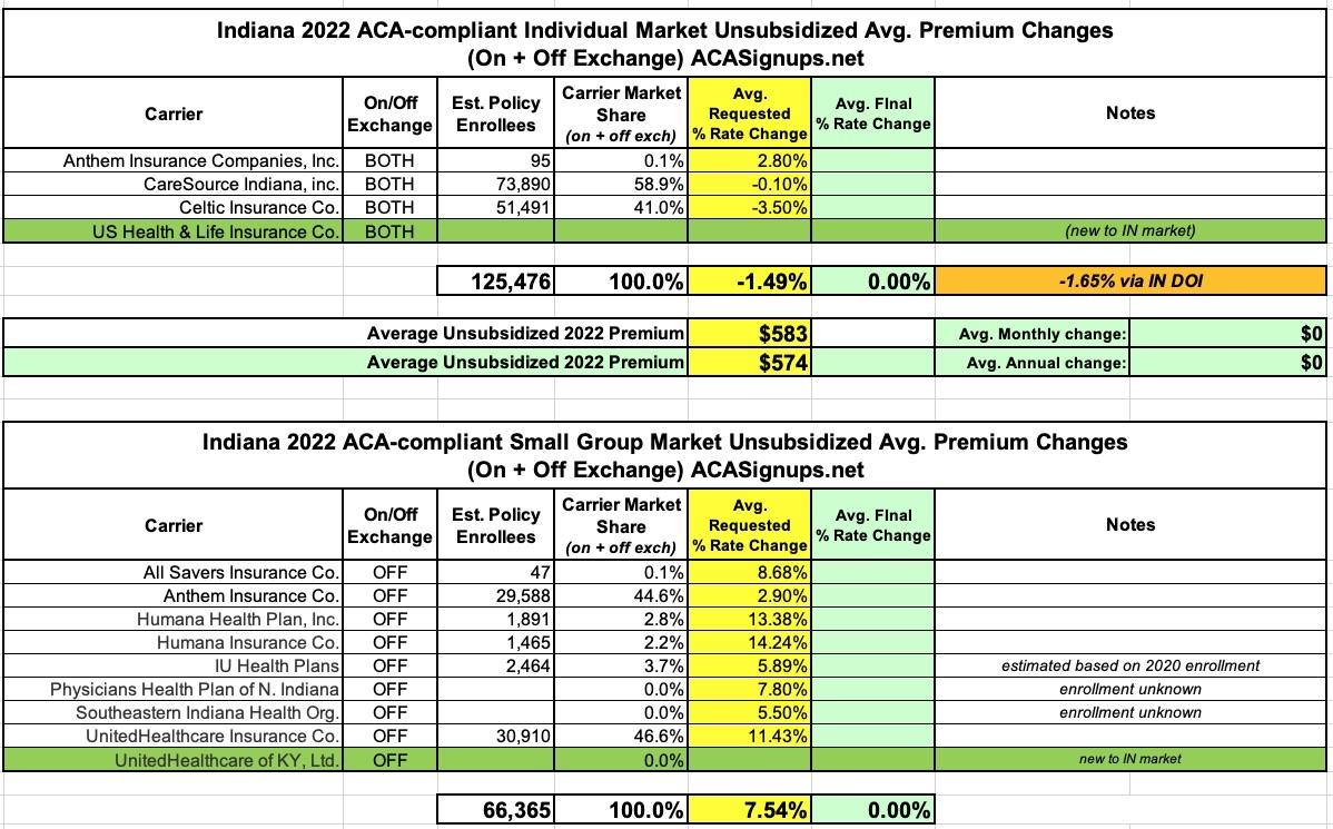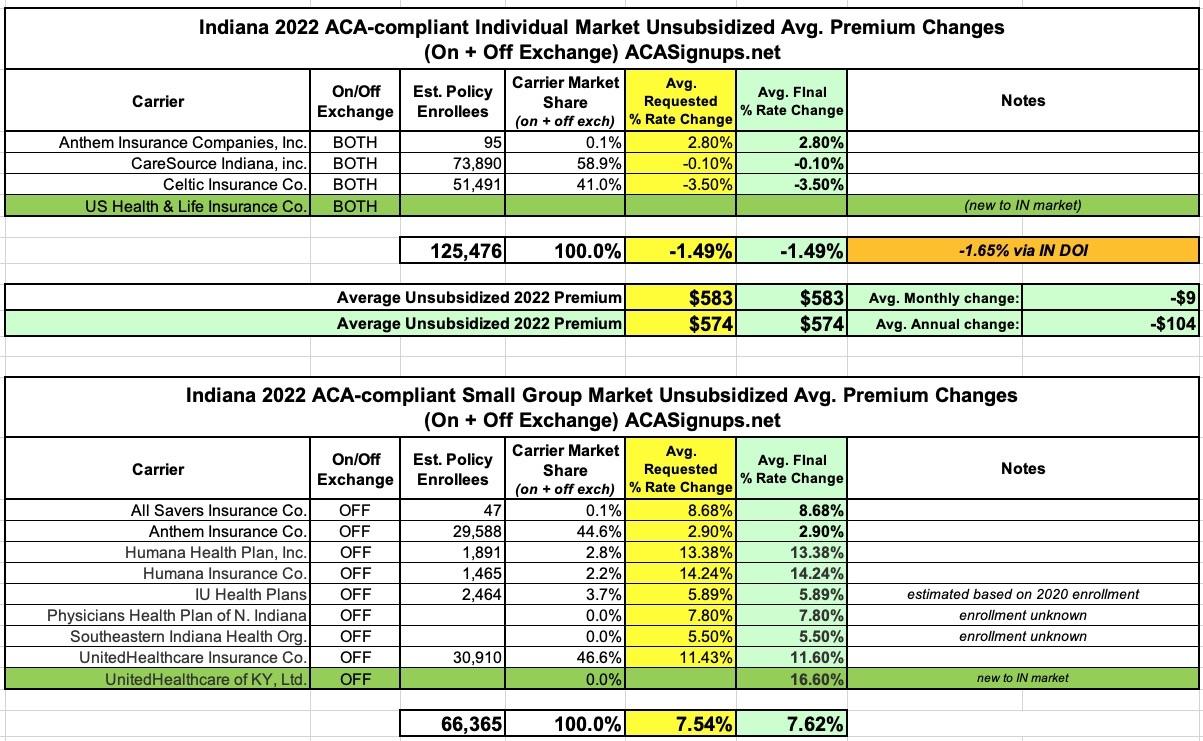 Indiana: Approved avg. 2022 #ACA rate changes: -1.7% indy market; +7.6% sm. group (updated)
