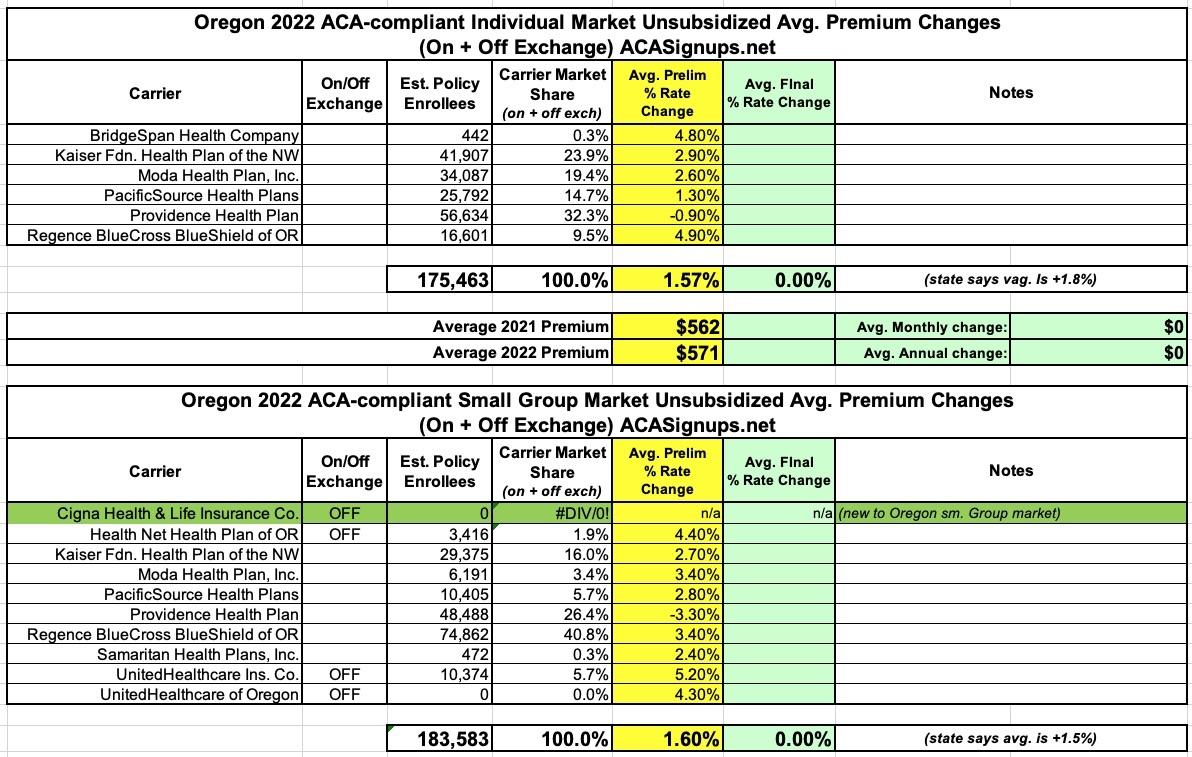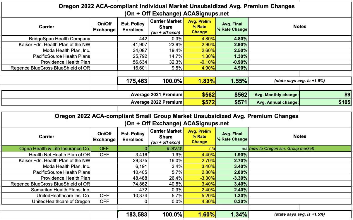 UPDATE 10/19/21: Oregon's Division of Financial Regulation has issued their approved rates for 2022. Not many changes, but it did shave down the average rates a bit in both markets: